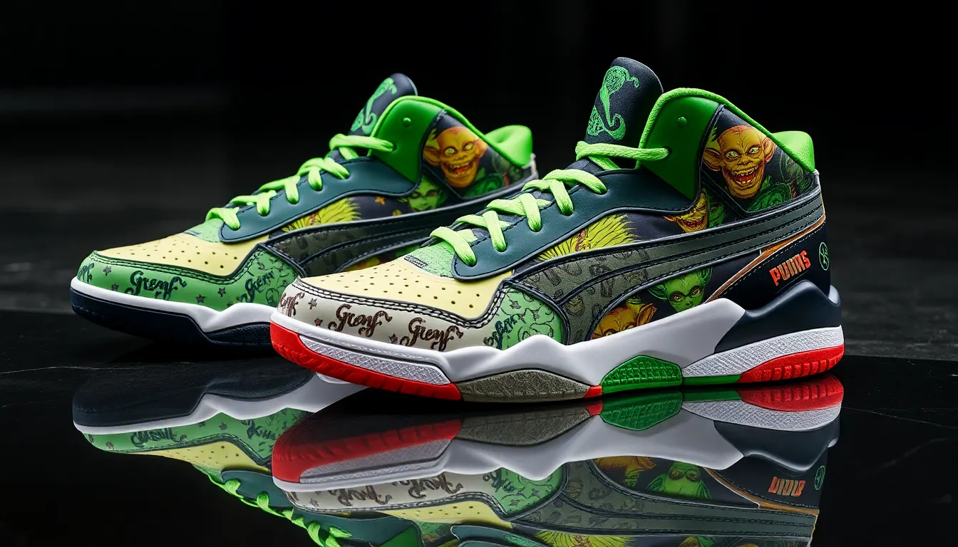 Bright colorways enhance the shoe’s appeal, capturing the whimsical essence of the Gremlins franchise. Iconic graphics prominently display fan-favorite characters, creating a bold visual statement. Green, black, and white tones dominate the palette, symbolizing the mischievous nature of the Gremlins. Unique patterns and textures offer additional flair, making these shoes suitable for both on-court performance and street style. Various iterations exist to cater to different tastes, appealing to both sneaker enthusiasts and casual wearers.